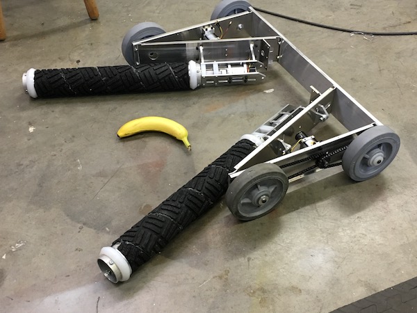 Pushy Grabber worked well except for one rotary lifter falling off during the match with "I can't believe it's not Overhaul". It took a few minutes in the pits to put it back on and continue. The way I had it attached it was pretty stupid so after we got back from DragonCon I rebuilt the coupler as one piece instead of two. It will not fail again. I also reduced the tubing diameter to 2 inches from 2.5 and wrapped them with rubber from a stronger mat. Photos below.